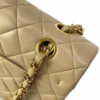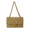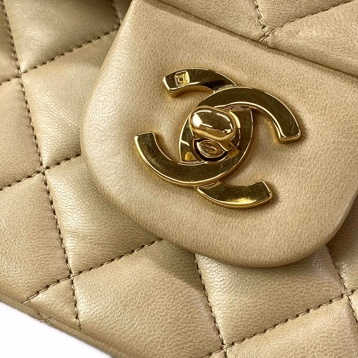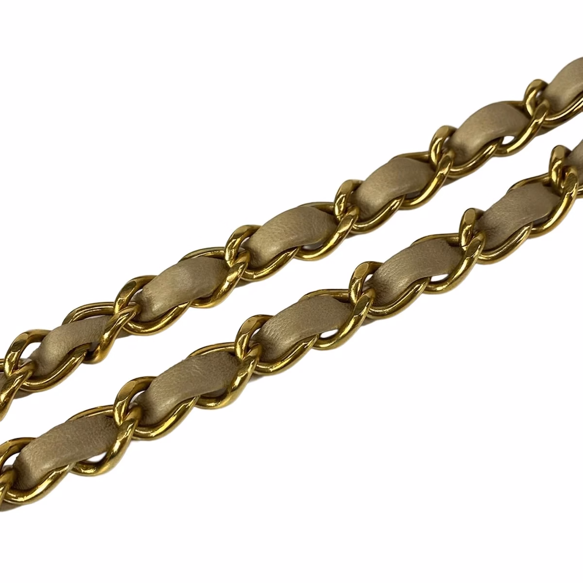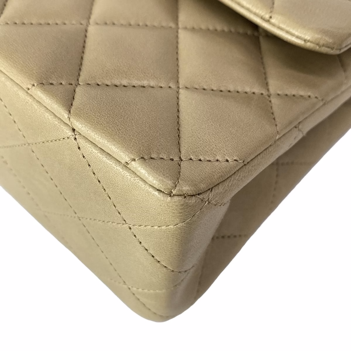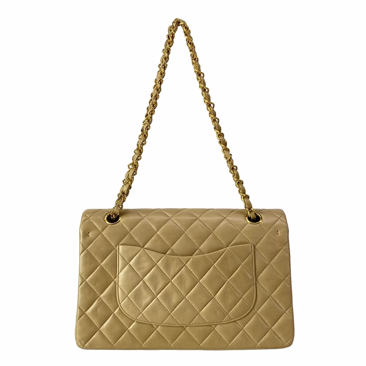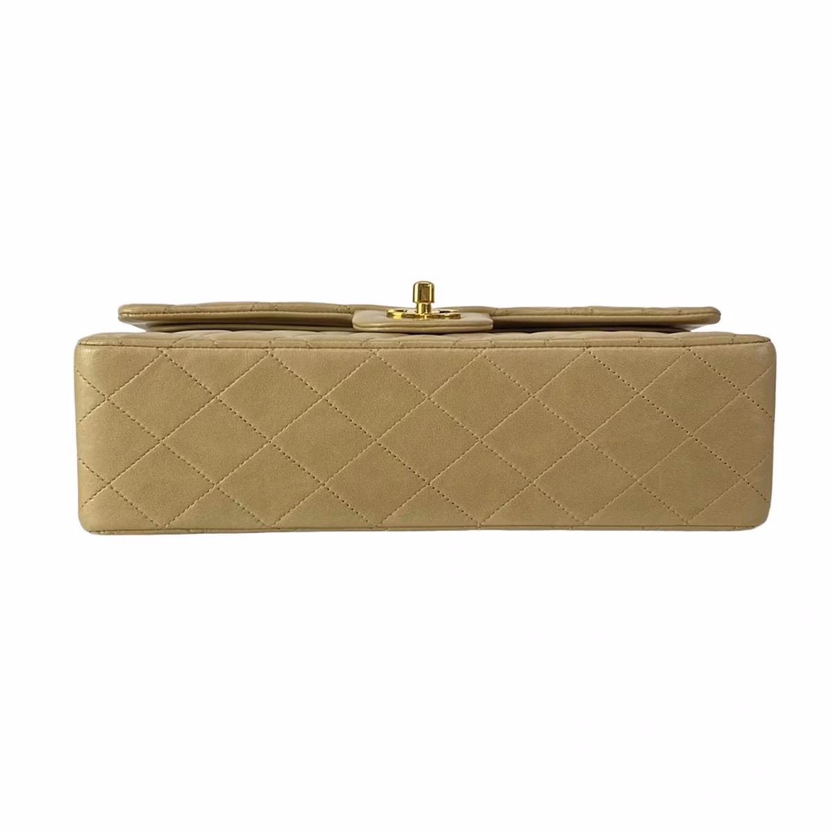 This elegant Chanel Double Flap bag medium in beige is one of the most popular bags for years. This pre-owned beauty features a lambskin leather body, a leather woven chain shoulder strap, double front flap with the well-known double C twist lock closure. The hardware is made of 24k gold. The exterior of this bag has a slip pocket on the back and the beige-colored interior has also a few slip pockets. We totally love this vintage treasure!