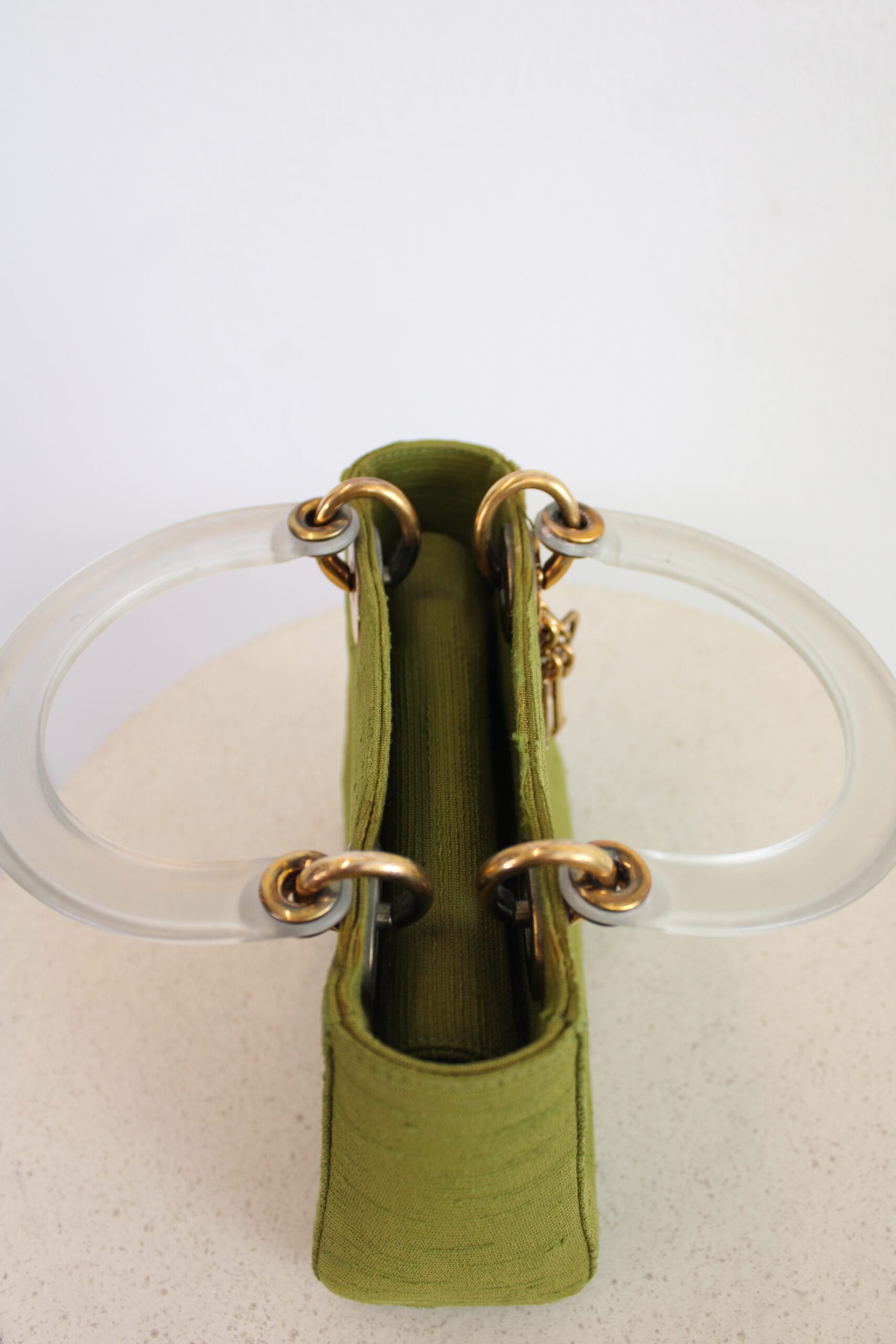 This is every womans dream bag: the Lady Dior. This beauty features a canvas body in this stunning green color, OMG! We almost kept this beauty for ourselves, because we are totally in love. The bag has two flat top handles in clear plastic. This square-sized bag has gold-colored hardware and DIOR letter pendants on it. The bag closes with the flap inside. Shop this beauty now!