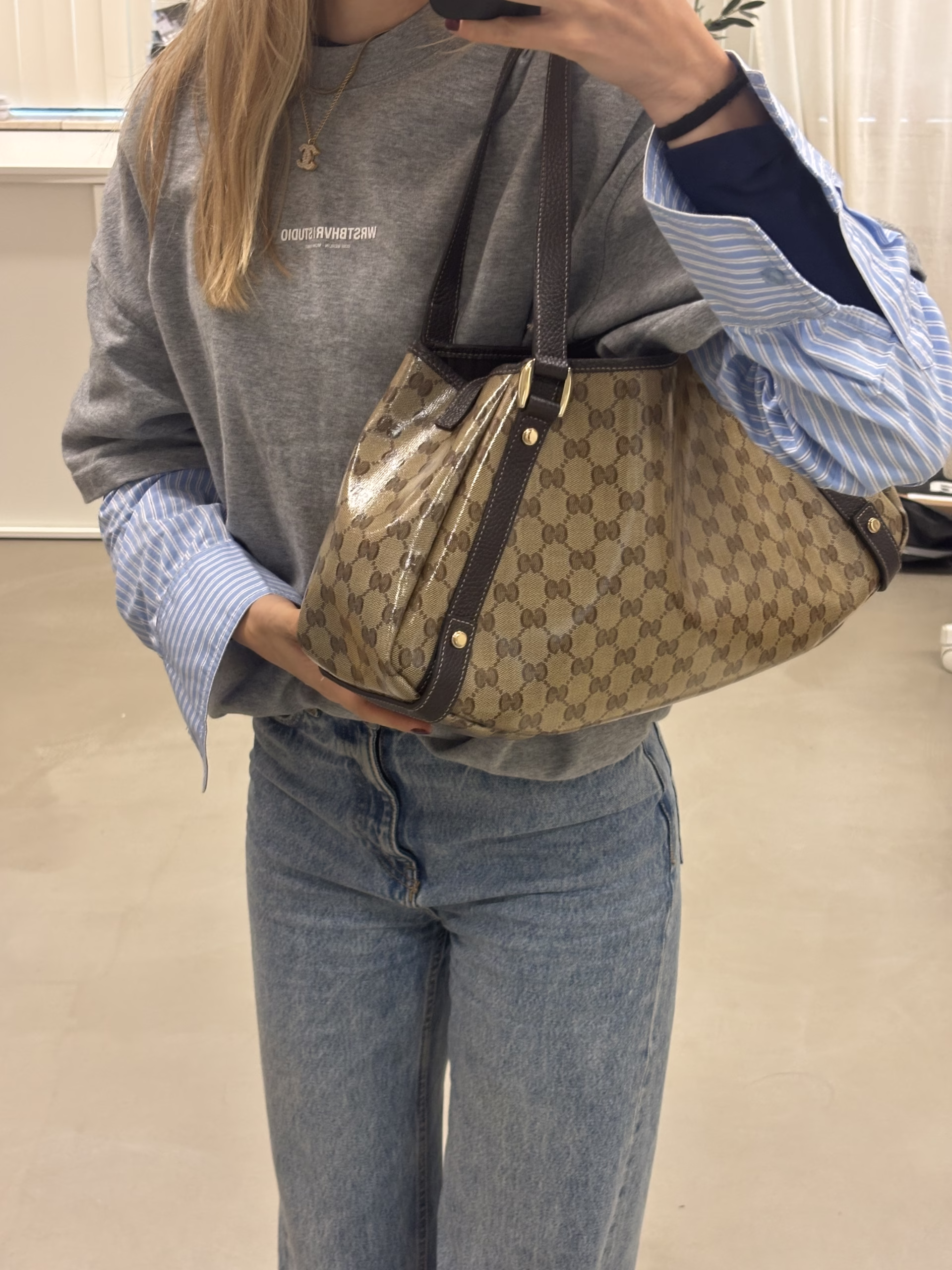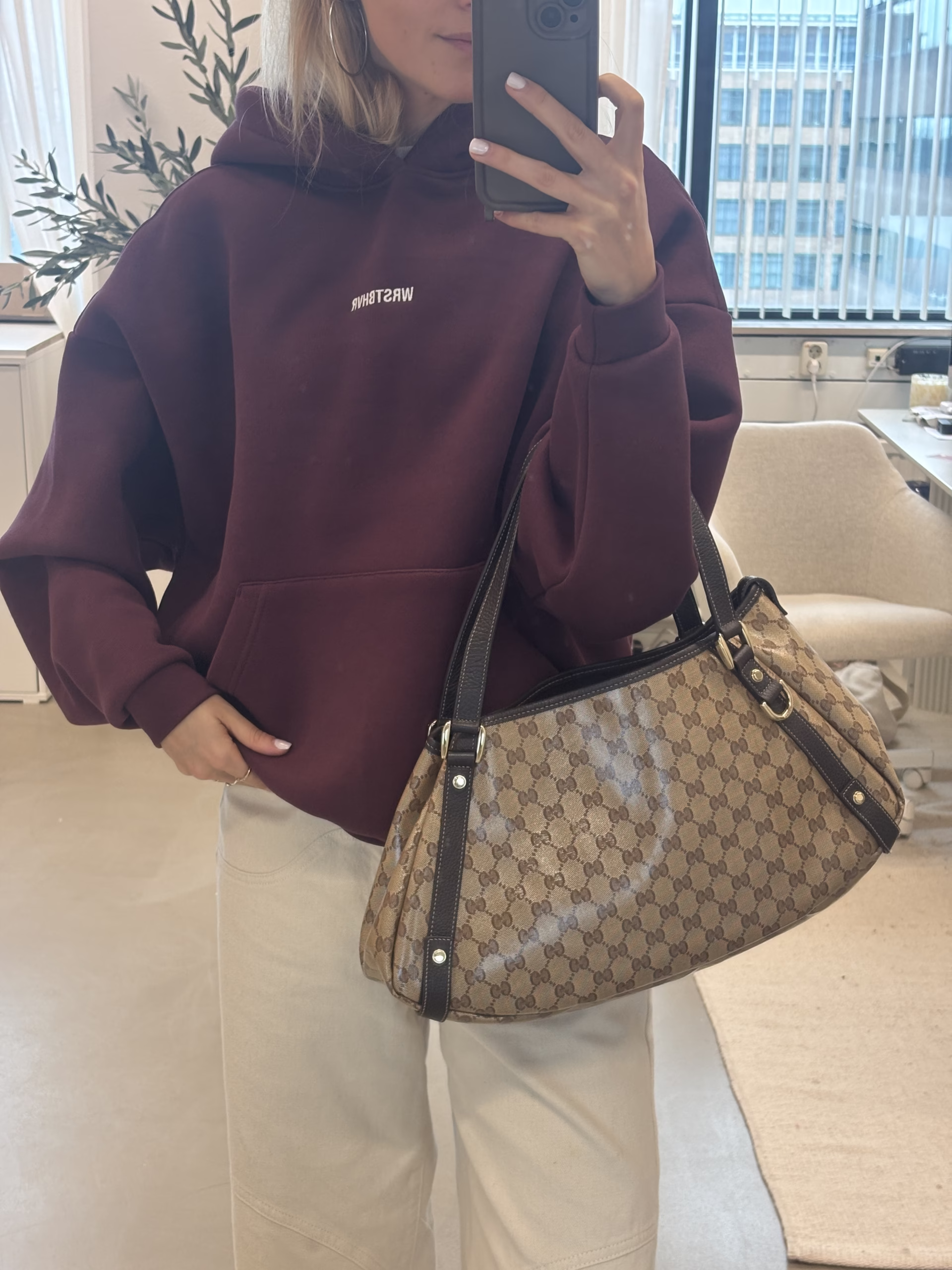 The Gucci Abbey Shoulder Bag in with patent coating is the perfect bag. It’s the IT bag of the moment and we totally get why. The bag has a beige canvas color and dark brown leather details, the perfect fall bag. On the canvas you’ll find the iconic GG canvas, which makes the bag very chic yet casual. The hardware is champagne-toned and the bag closes with a stud. It’s the coolest bag for every day use! We love it!
