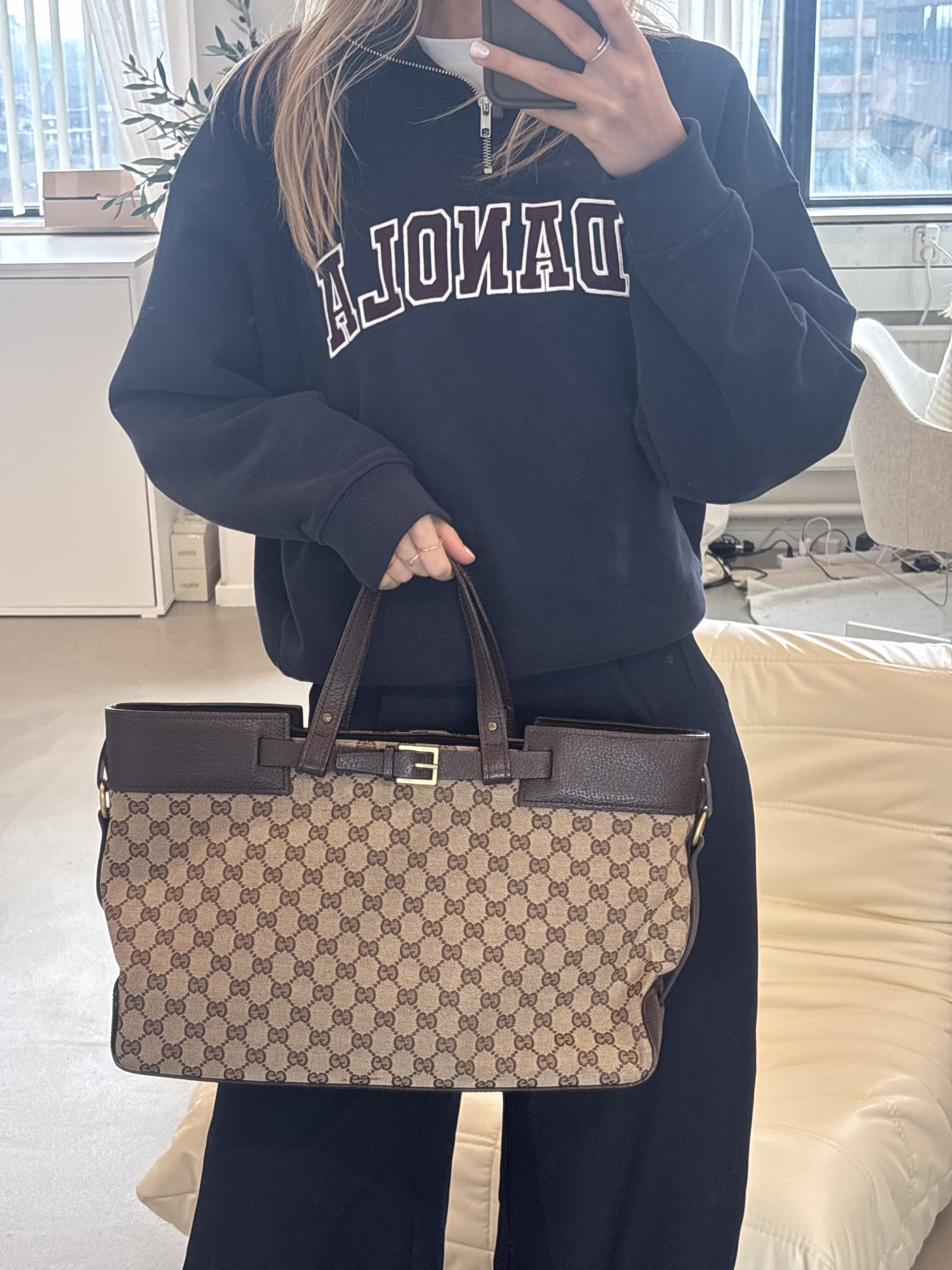 The Gucci Horizontal Tote Buckle Bag in Beige Brown is the perfect every day bag. This beauty features the GG-logo all over the canvas. The details of this bag are made of leather and the bag has gold toned hardware. We love the eye-catching buckle on the front! The inside has one main compartment and one smaller side pocket with zipper. The perfect work/school bag!