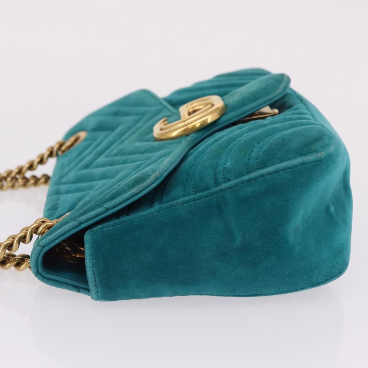 The Gucci Marmont Velvet Turquoise is one of our favorite pieces of the Gucci house. The bag is a small-size and known for its luxurious design and signature interlocking GG logo. You can wear it crossbody or as a shoulder piece. The hardware is gold toned. The bag has a front flap with closure and the inside has one main compartment and smaller side pocket. We love this eye-catcher!