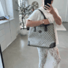 The Gucci GG Tote Bag PVC is the perfect every day bag. It will fit all your daily essentials and upgrades every outfit. This beauty is beige colored and has dark brown leather details. The tote has two top handles and the three compartments close with a magnet closure and a zipper. The main compartment has one extra pocket with a zipper. The perfect work/school bag!