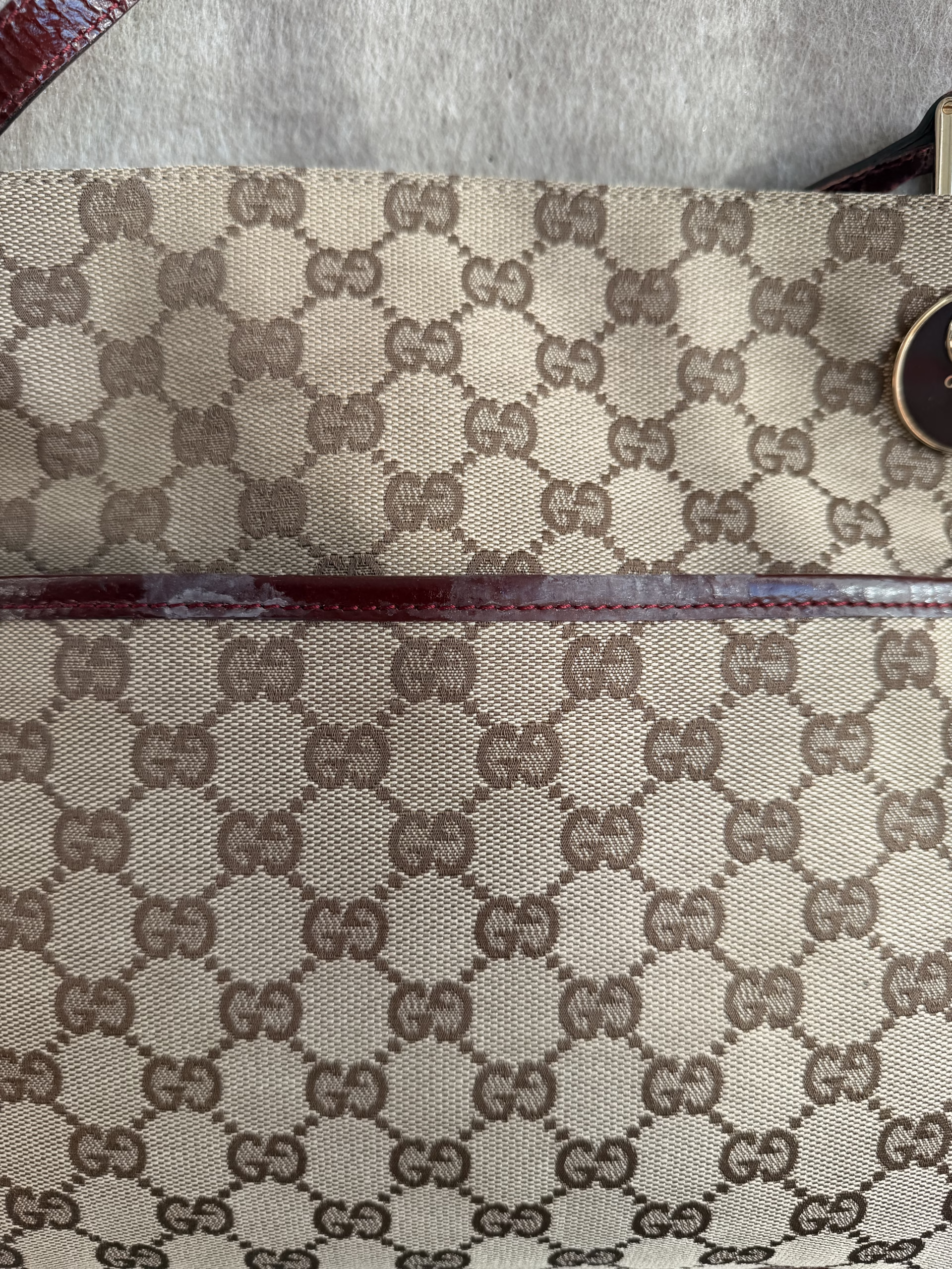 7.5/10 – Good condition. Some white faded signs on the bordeaux patent leather. Hardware and canvas look good.