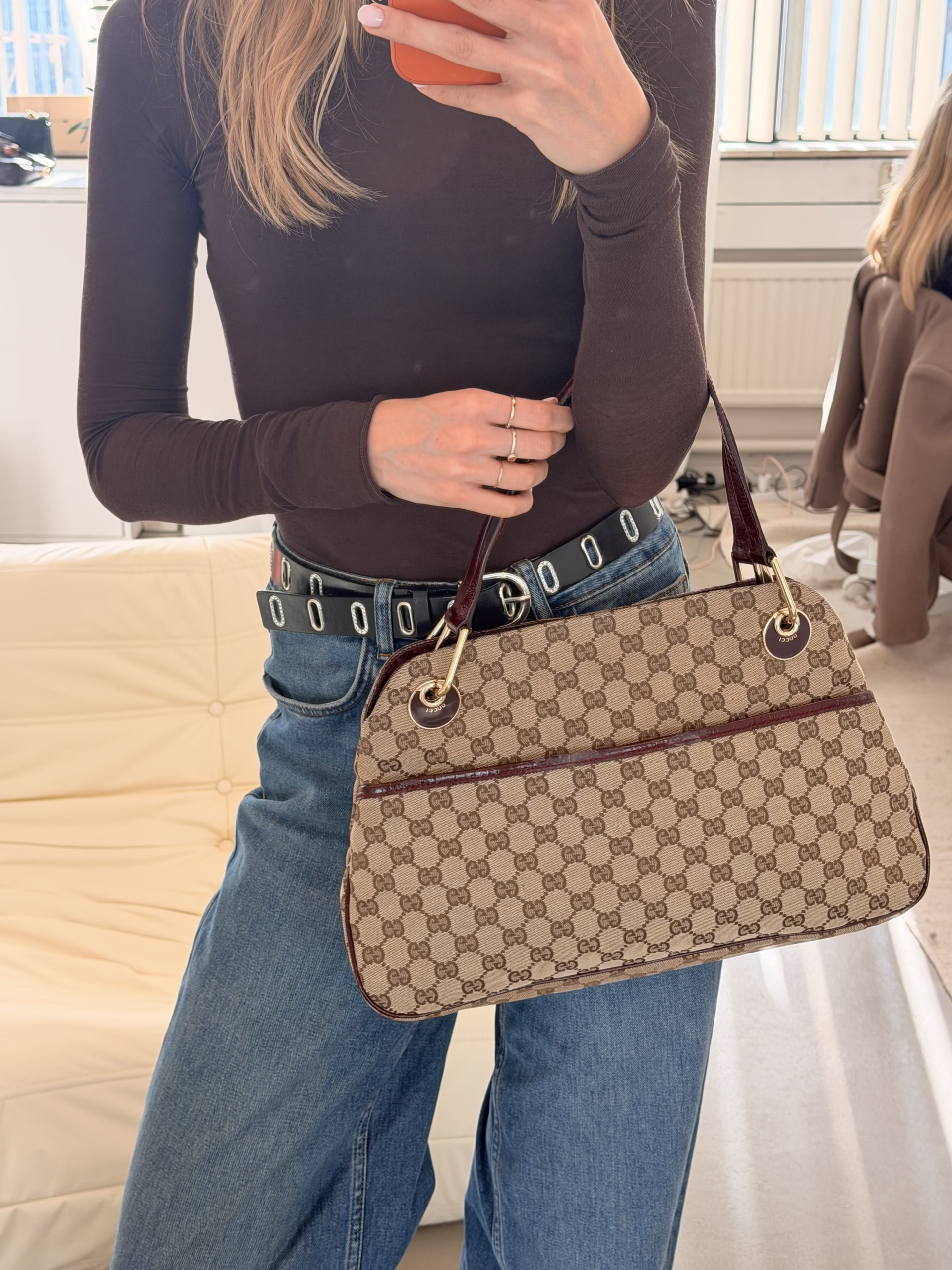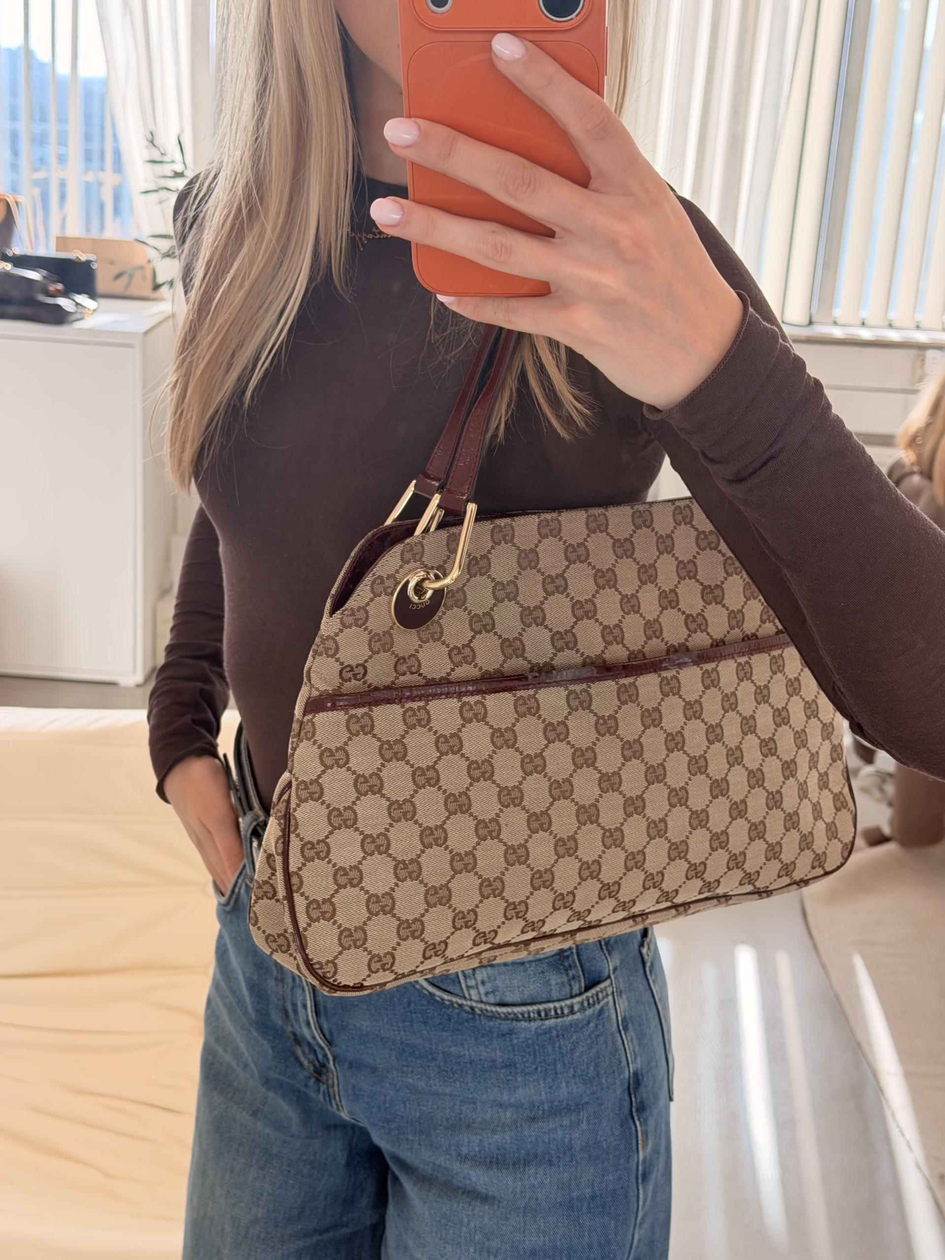 Eye-catcher! The cute Gucci Shoulder Bag is the perfect every day bag. This beauty features the GG-logo all over the beige canvas. The details of this bag are made of bordeaux patent leather, so cool! The bag has stud closure and gold-colored hardware. The inside has one main compartment and one side pocket. Take this stunning Gucci piece with you on a day or night out and upgrade your look!