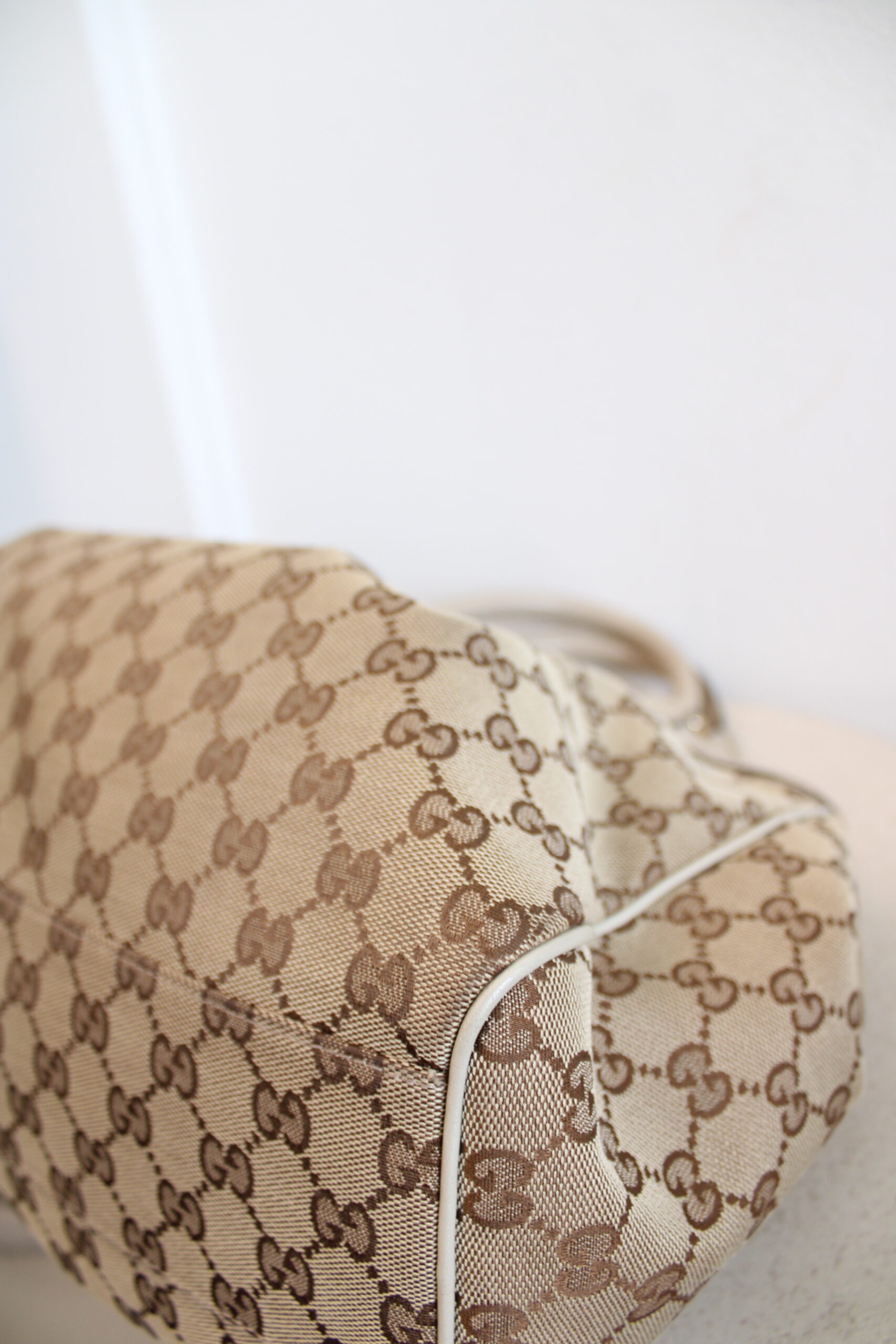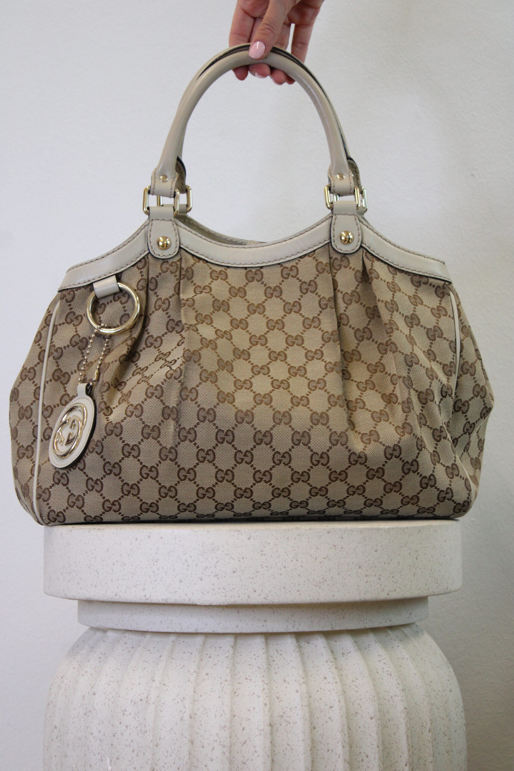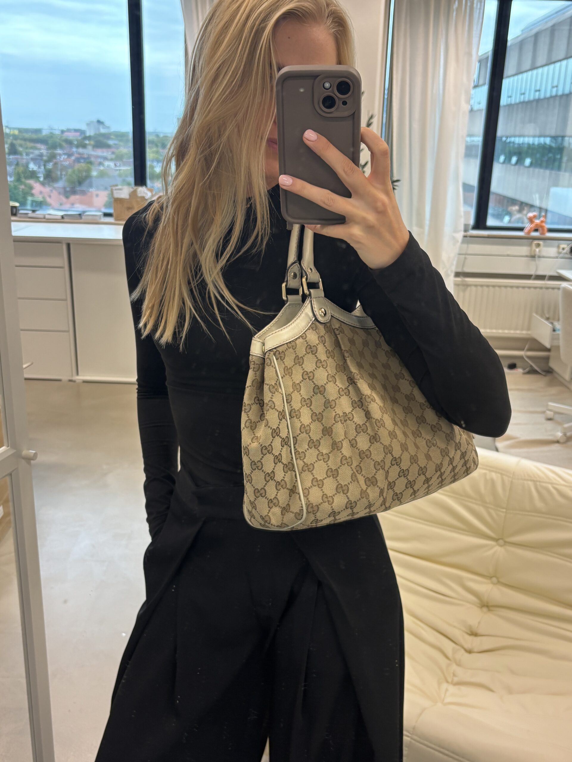 The Gucci Sukey Tote in beige is the perfect every day bag. It’s the IT bag of the moment and we totally get why. The bag has a beige canvas color and white leather details. On the canvas you’ll find the iconic GG canvas, which makes the bag very chic yet casual. The bag features a cute Gucci charm. The hardware is gold-toned and the bag closes with a zipper. It’s the perfect bag for every day use! We love it!