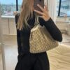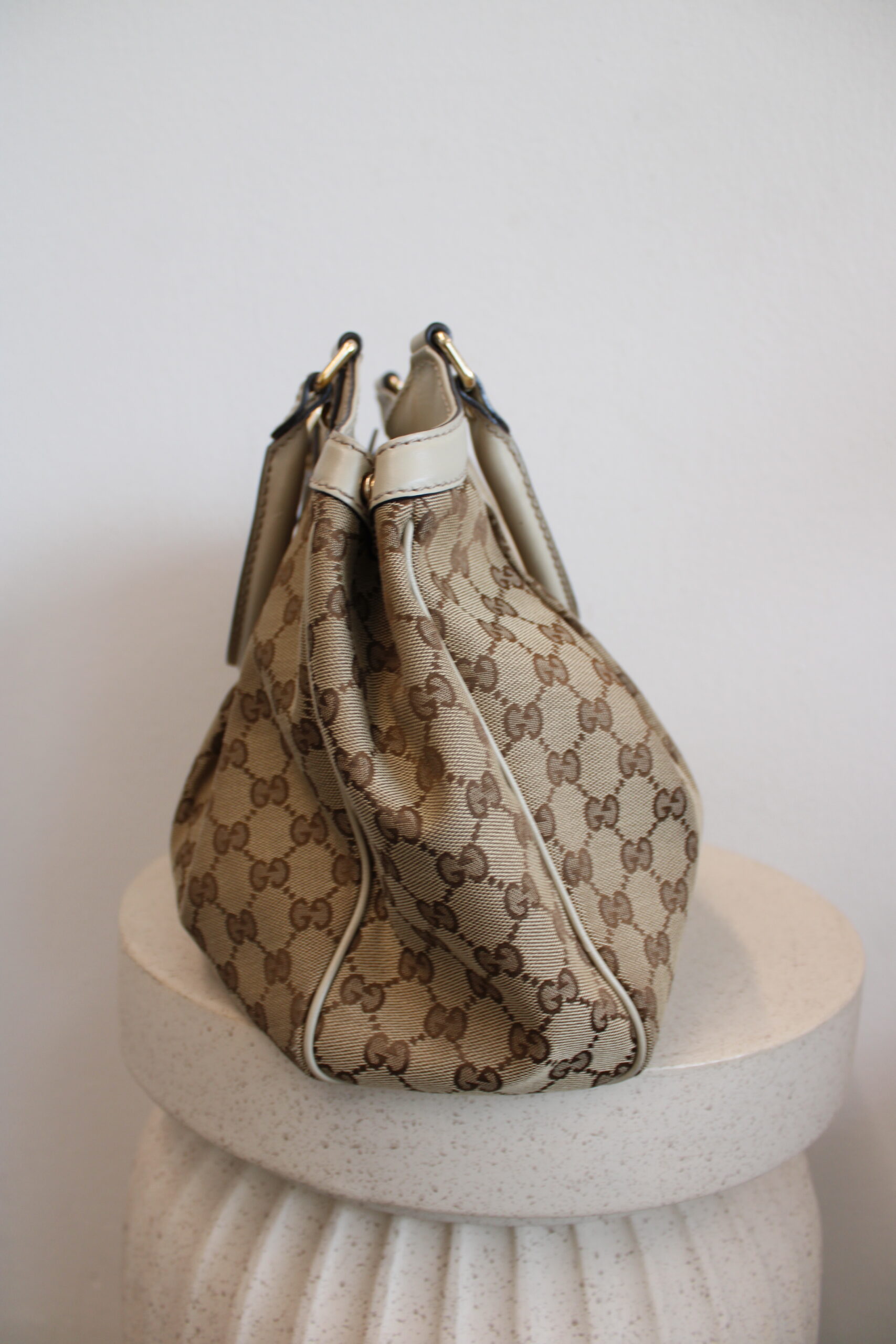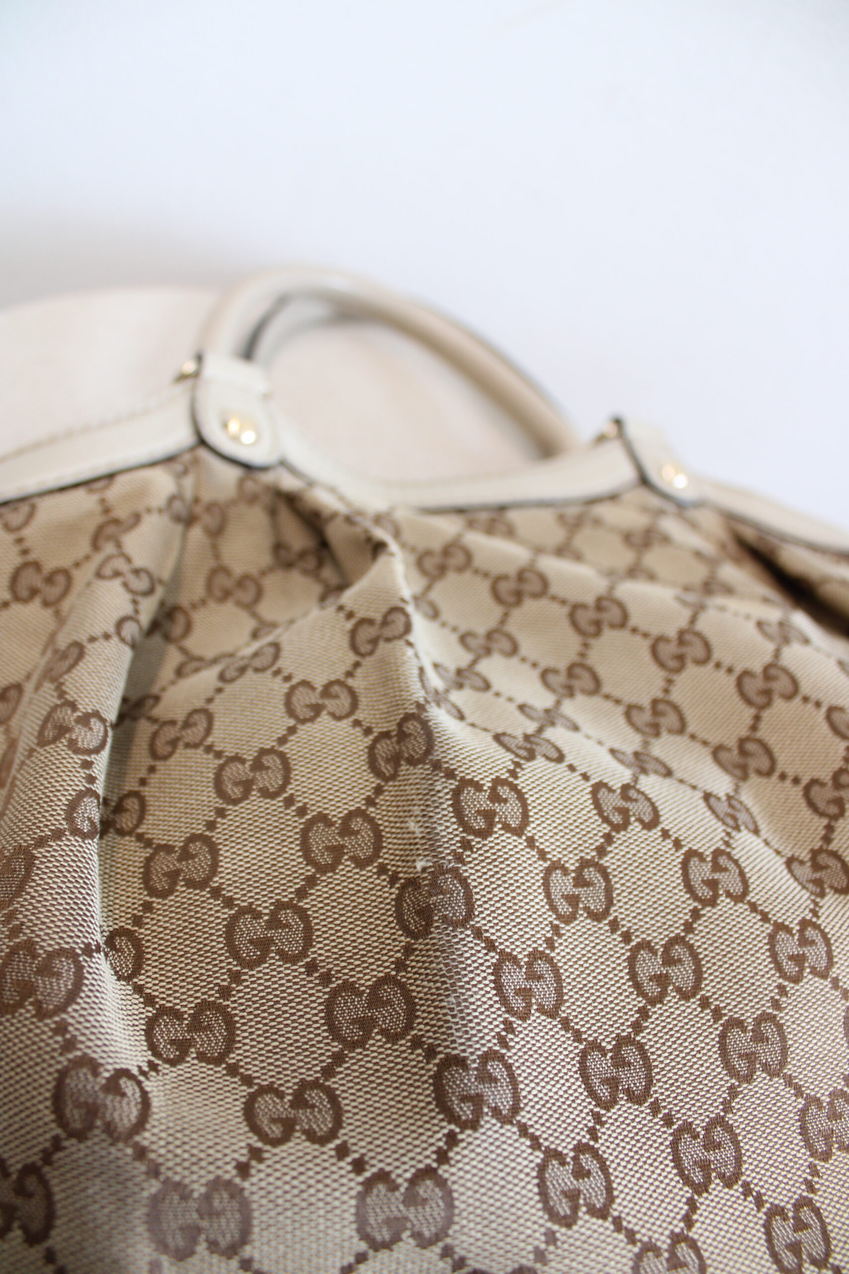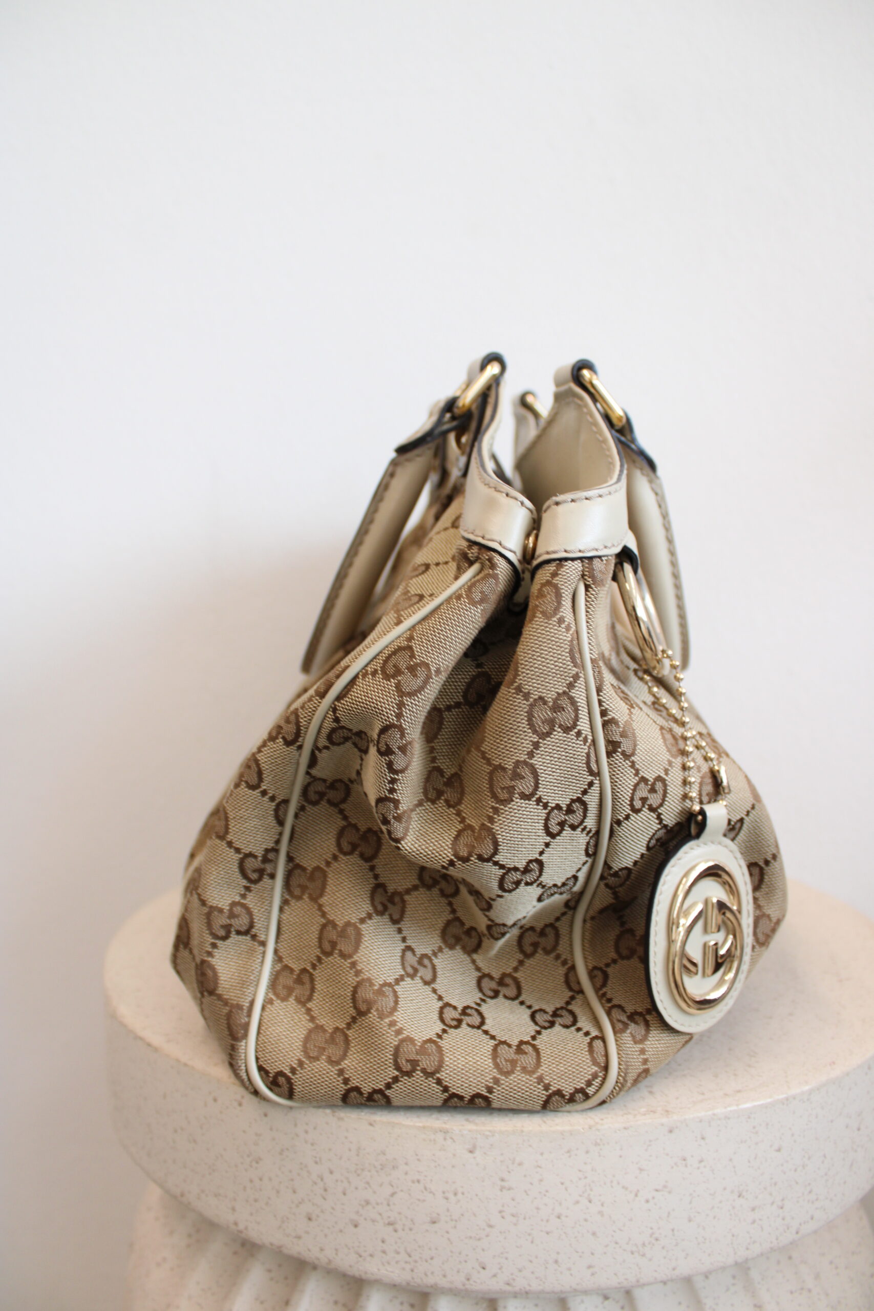 The Gucci Sukey Tote in beige is the perfect every day bag. It’s the IT bag of the moment and we totally get why. The bag has a beige canvas color and white leather details. On the canvas you’ll find the iconic GG canvas, which makes the bag very chic yet casual. The bag features a cute Gucci charm. The hardware is gold-toned and the bag closes with a zipper. It’s the perfect bag for every day use! We love it!
