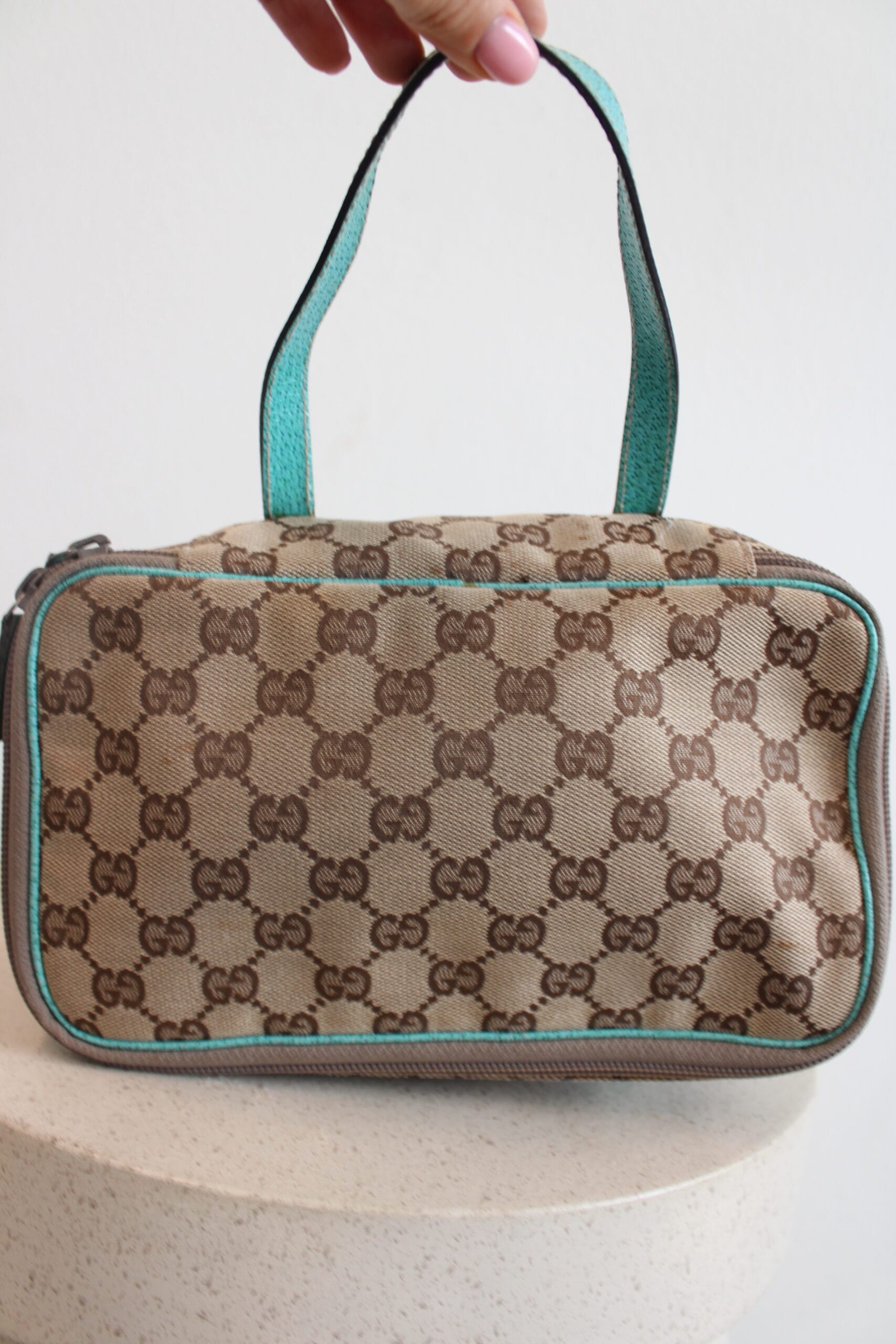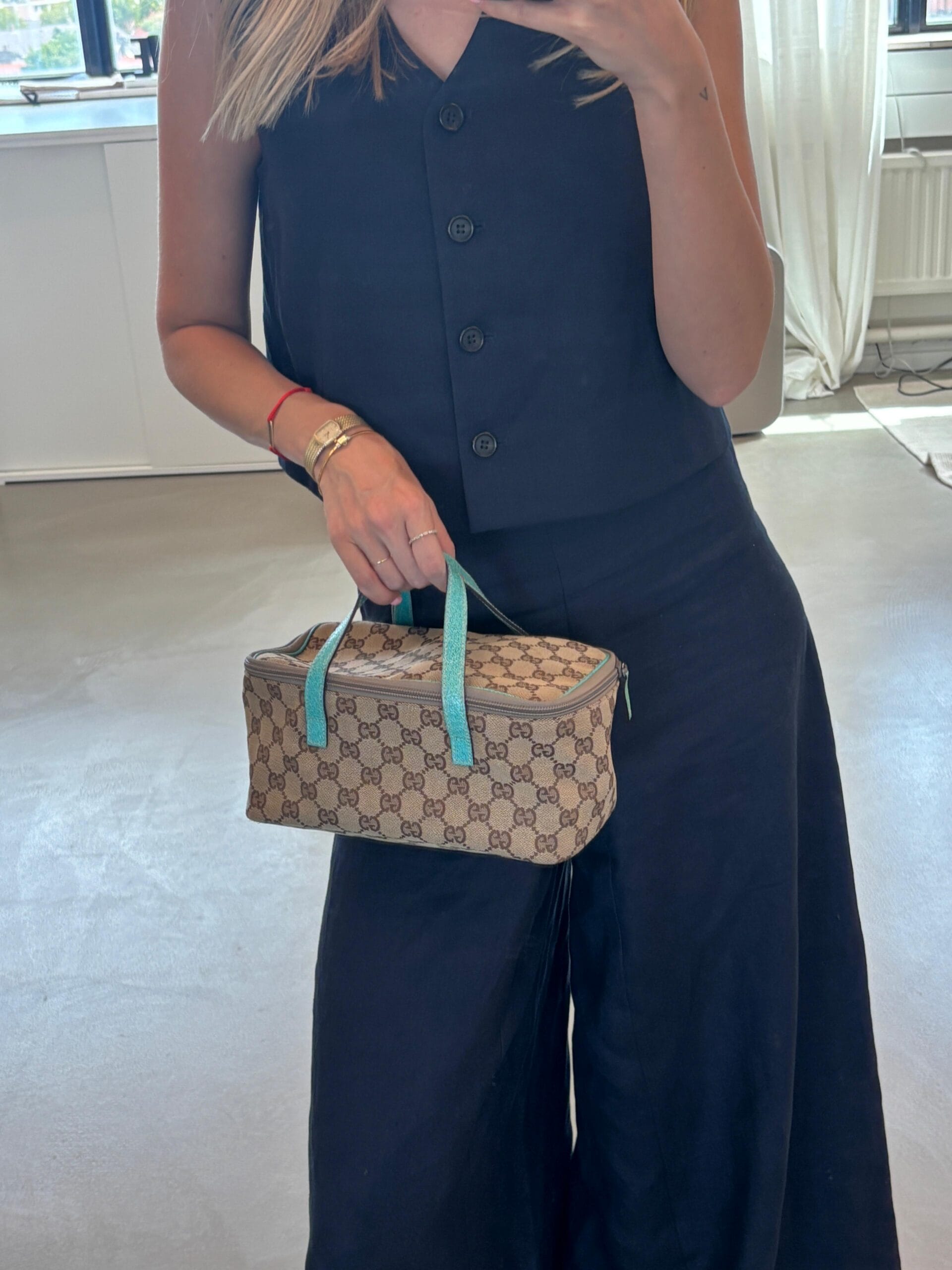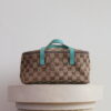 Cute vanity pouch alert! The Gucci Vanity Pouch Beige Mint is the perfect every day toiletry bag. The bag has a beige canvas color and mint green/blue leather details. On the canvas you’ll find the iconic GG canvas, which makes the pouch so cool! We love it!