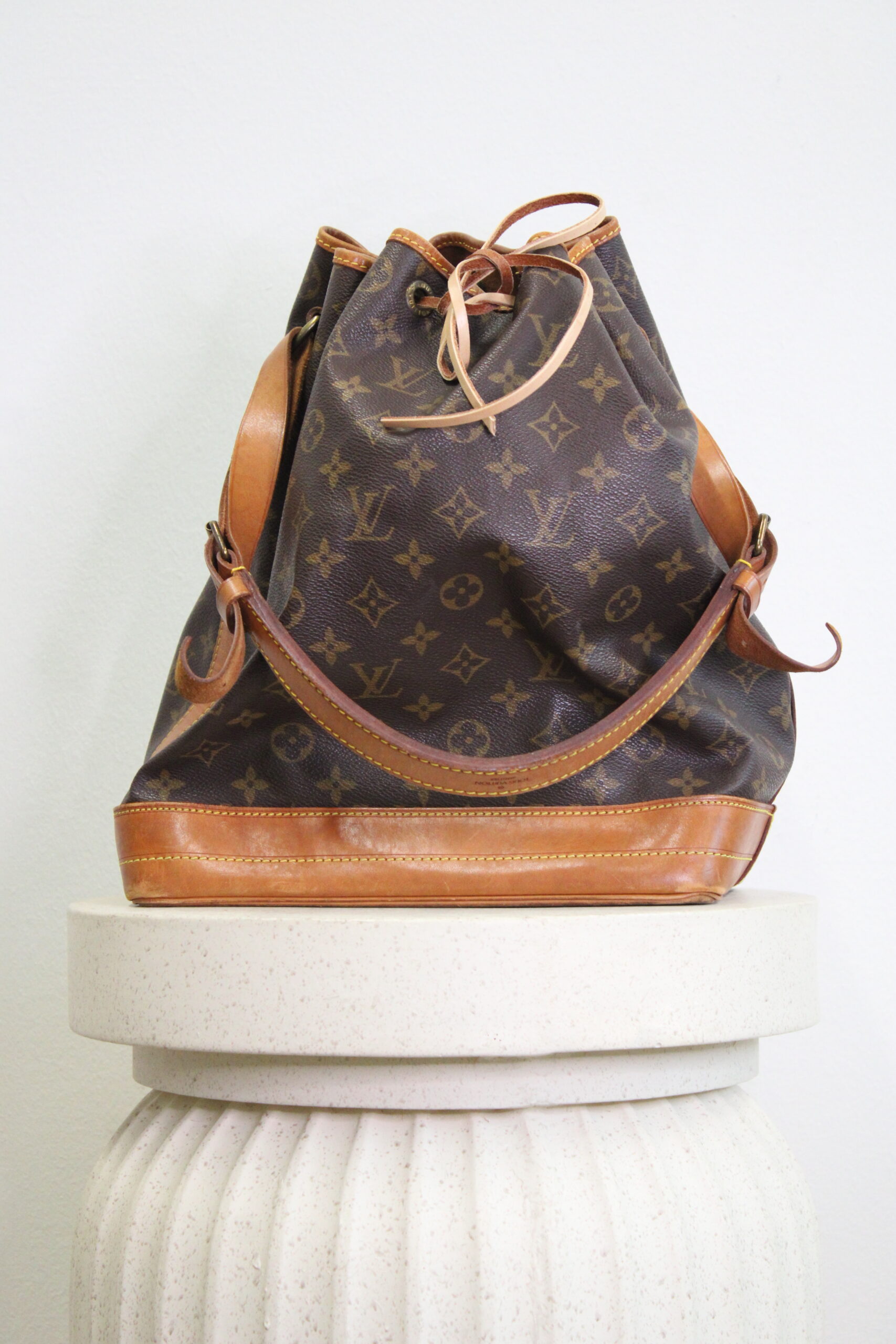 The Louis Vuitton Noé bag was originally designed to carry bottles of champagne, as its shape and size were perfect for holding bottles upright. Over the years, the Louis Vuitton Noé has become an iconic and highly sought-after handbag. It is known for its bucket-like shape, drawstring closure, and adjustable shoulder strap. The bag is crafted from Louis Vuitton’s signature Monogram canvas, featuring the iconic LV monogram pattern.