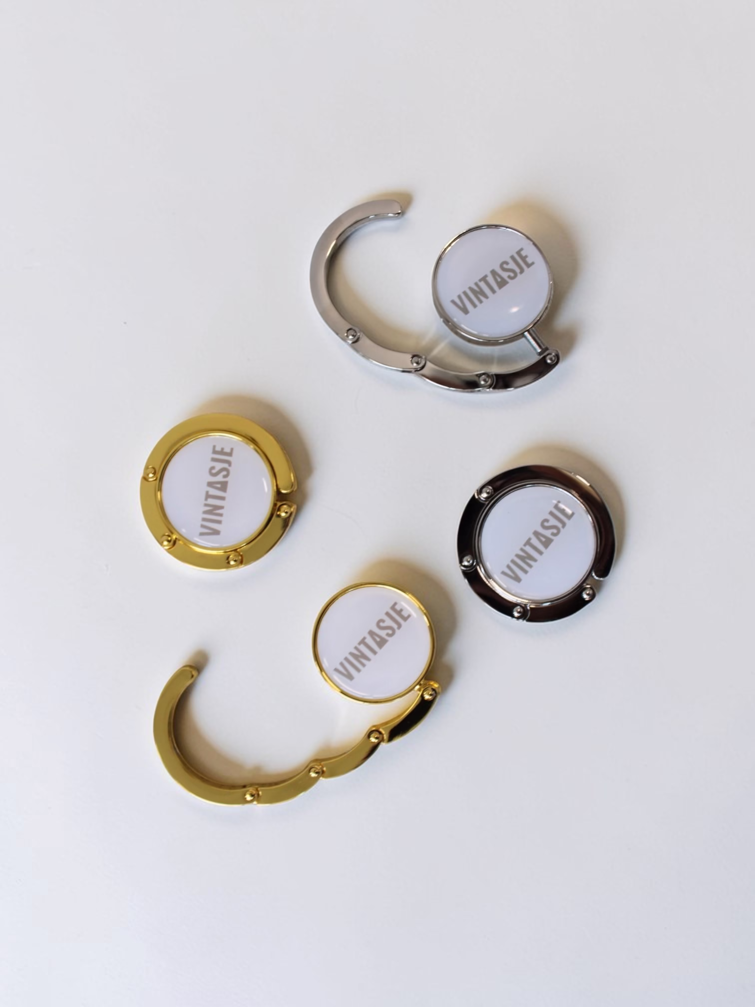 Now available for you; the Vintasje bag holder! If you are a purse lover, you absolutely need this item in your life. You will never need to worry again about putting your (expensive) bag on the floor or table, now you can place it on the bag holder! You can choose between a gold or silver toned bag holder with our beige logo on the white top.